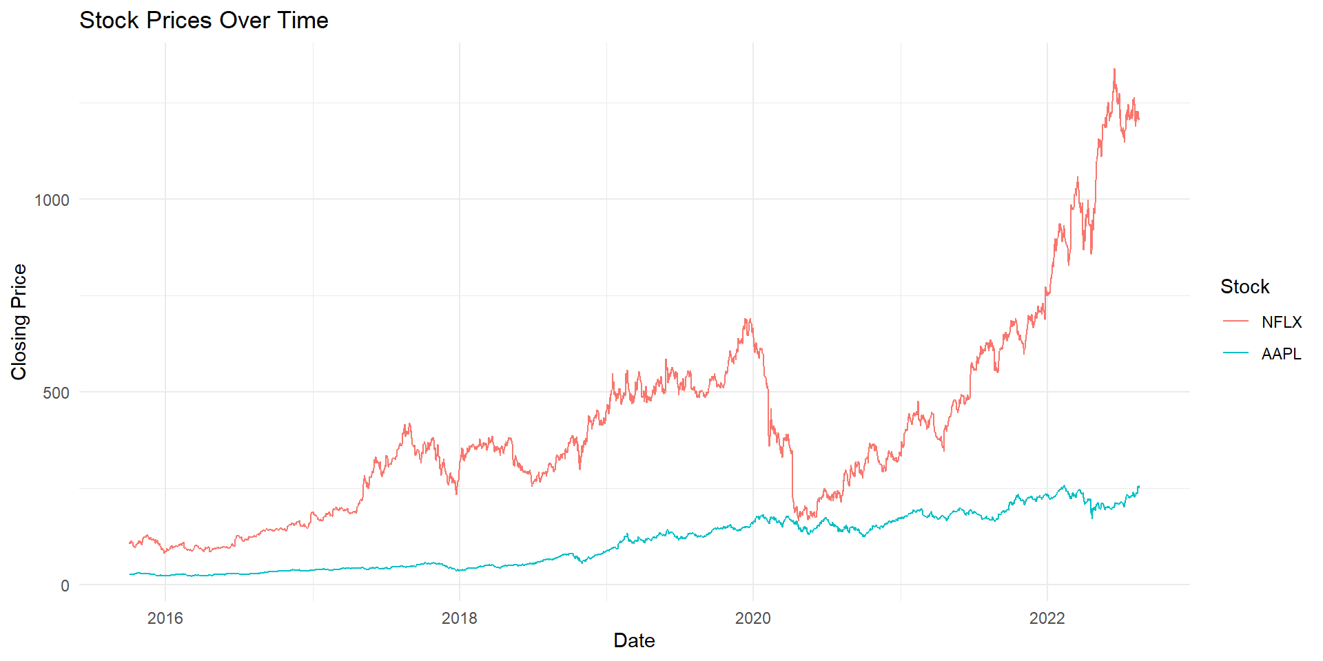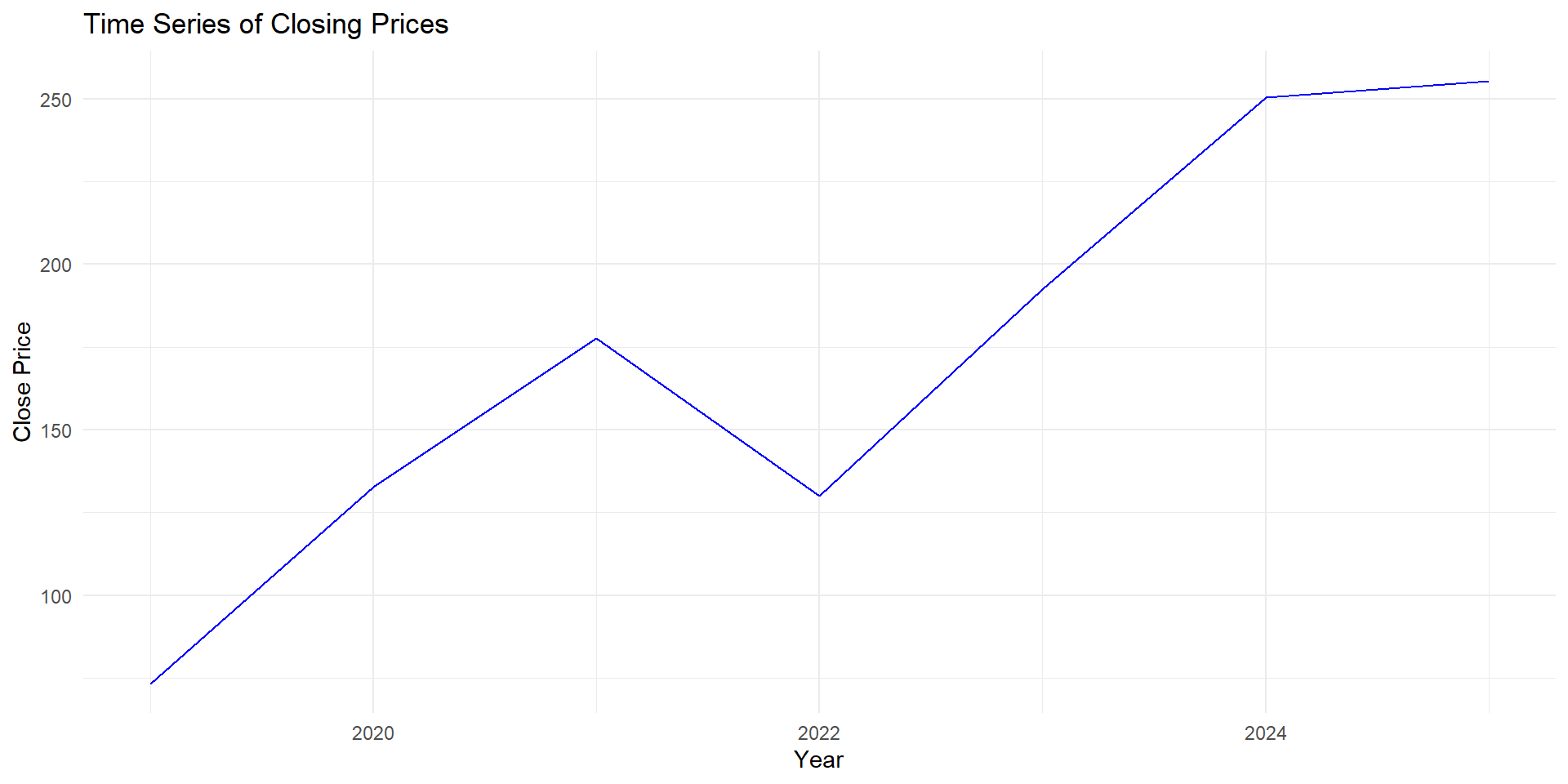 Let the close price for Apple be represented by the variable \(y_t\), so \(y_{2019}\) is the close price we got for 2019 (i.e. 73.41).