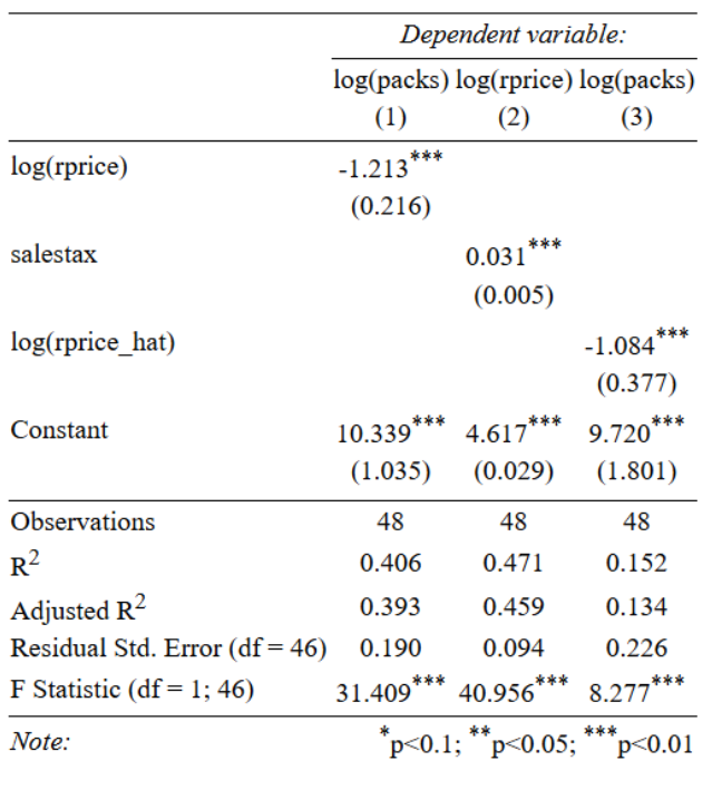 The output in the next slide presents estiamtes for three different specifications: 1. is a simple linear regression for the price elasticity; 2. is the first-stage of the 2SLS Estimator 3. the second stage of the 2SLS.